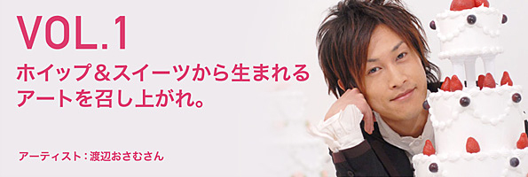ピックアップタイトル@Person第一回目のゲストは、「スイーツアートの貴公子」の異名を持つ渡辺おさむさん。彼のクリームを使った表現は、東京造形大学の学生だった10年前から展開されてきたもの。近年ではアニメやインテリア企業とクリームのコラボレーションなど活躍の幅を広げ、5月にはホビーショーのゲストとして出演予定。そんな渡辺さんにスイーツアートの魅力とパワーの理由をうかがいに、アトリエにお邪魔しました。